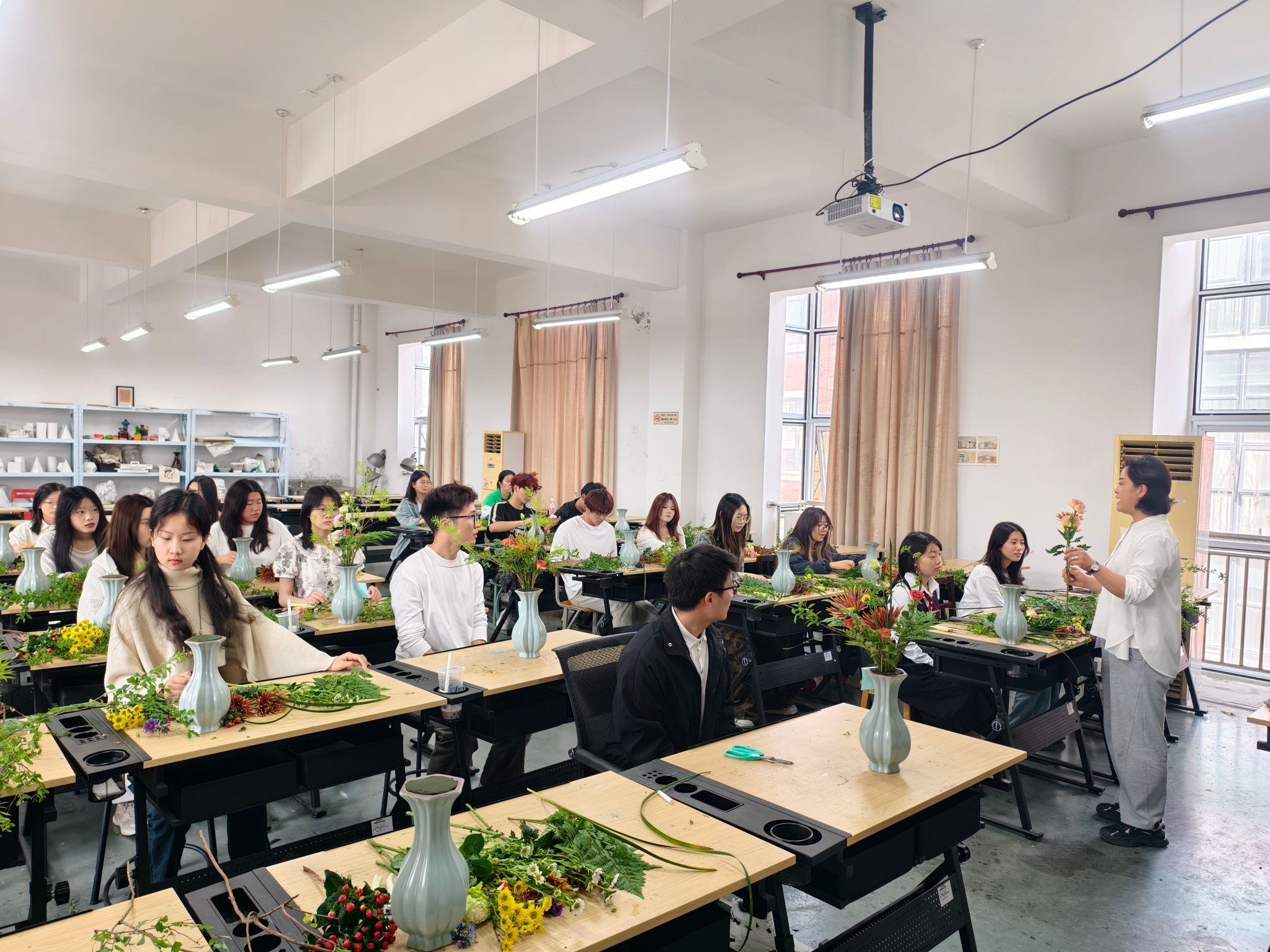 活动以弘扬中华优秀传统文化为核心,依托《中国传统工艺制作》《室内软装设计》等课程实践体系,创新融合非遗插花技艺与现代设计理念 91天堂国产在线,参赛者以汝窑瓶器为载体,通过选材,构图,造型等环节展现传统瓶花艺术精髓,现场设置技法示范,创意实践与作品评析三个环节,张洪梅老师结合花材特性,文化符号及空间美学进行专业指导,引导学生实现“技艺传承”与“当代表达”的双重突破。