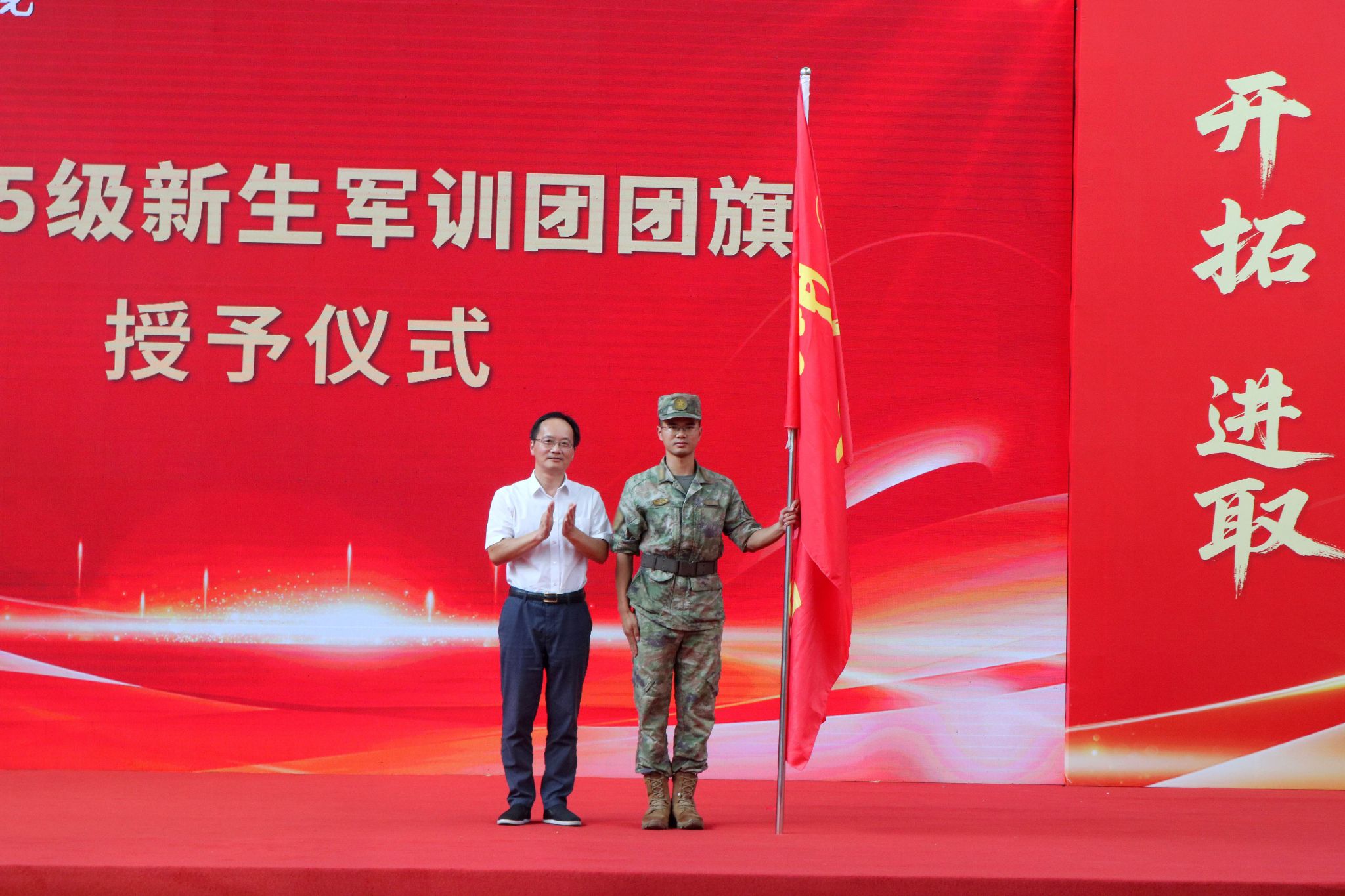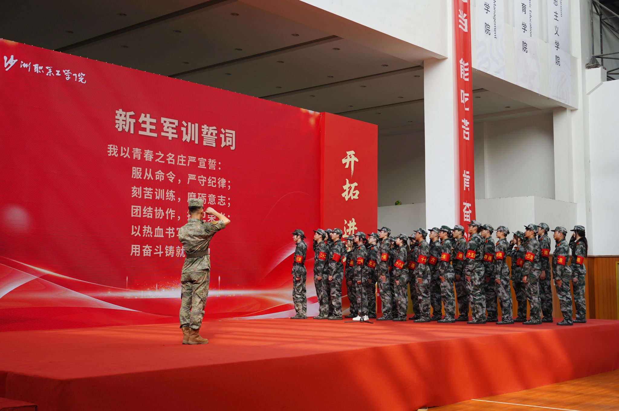 党委书记钱锦东向军训团团长授团旗,承训部队负责人作军训动员讲话 亚洲91,军训团23个连队代表上台进行宣誓仪式,大会在师生共唱《歌唱祖国》的歌声中圆满落幕,现场气氛热烈而庄重。
