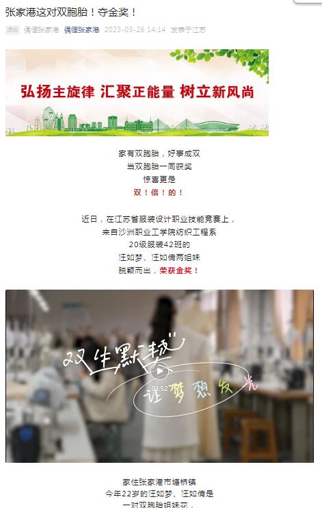 【偶俚张家港】张家港这对双胞胎!夺金奖!